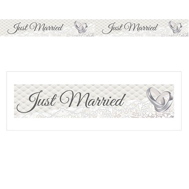 Das Absperrband "Edle Hochzeitsfeier" hat eine Gesamtlänge von ca. 15 m und besteht aus mattem, weichem Kunststoff. Das Band ist überwiegend in den Farben Grau, Beige und Weiß gehalten und zeigt die Aufschrift "Just Married" sowie Eheringe.