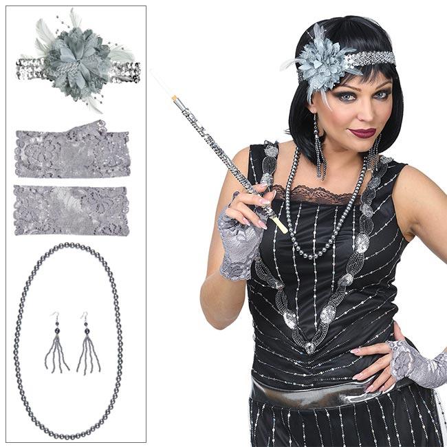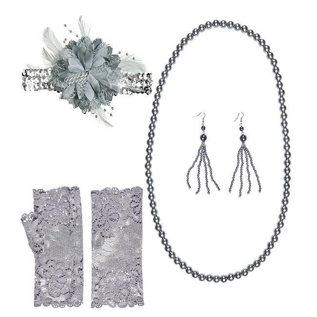 Das Accessoire-Set "20s Flapper Girl" ist 6-teilig und besteht aus einem Paar Ohrringe (ca. 12 cm) mit Haken, einer Perlenkette (ca. 40 cm), einem Paar fingerloser Handschuhe (ca. 16 cm) sowie einem grauen Stirnband (ca. 19 cm). Alle Accessoires sind in Grau, bzw. in Silber gehalten. Ohrringe als auch Kette (elastisch) bestehen aus grauen, schimmernden Perlen. Das Stirnband ist mit einer ca. 9 cm großen Blum verziert. Im Lieferumfang ist ausschließlich die Kette, ein Paar Ohrringe, ein Paar fingerlose Handschuhe sowie das Stirnband enthalten. Andere abgebildete Artikel werden NICHT mitgeliefert.