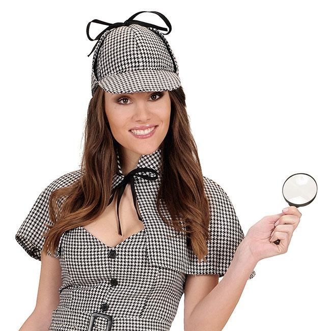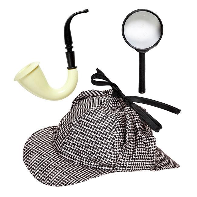 Das Accessoire-Set "Detektiv" ist dreiteilig und besteht aus einer Mütze, einem ca. 12,5 cm großen Vergrößerungsglas (funktionstüchtig) und einer ca. 13 cm großen Pfeife. Die Mütze wird in einer Einheitsgröße für Erwachsene geliefert. Sie ist im typischen schwarzweißen Hundezahn-Muster gehalten. Im Lieferumfang ist ausschließlich die Mütze, eine Lupe und eine Pfeife enthalten. Andere abgebildete Artikel werden NICHT mitgeliefert.
