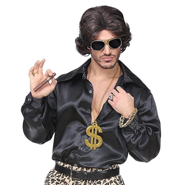 Das Accessoire-Set "Gangster" umfasst drei verschiedene Teile: Eine Sonnenbrille, eine Dollar-Halskette und ein Armband. Bitte beachten Sie, dass nur diese Dinge zum Lieferumfang gehören. Alle anderen Artikel, die Sie der Abbildung entnehmen können, werden NICHT geliefert. Sämtliche Teile bestehen aus Kunststoff und sind goldfarben; das Dollarzeichen der Halskette ist sogar mit Glitzer versehen.