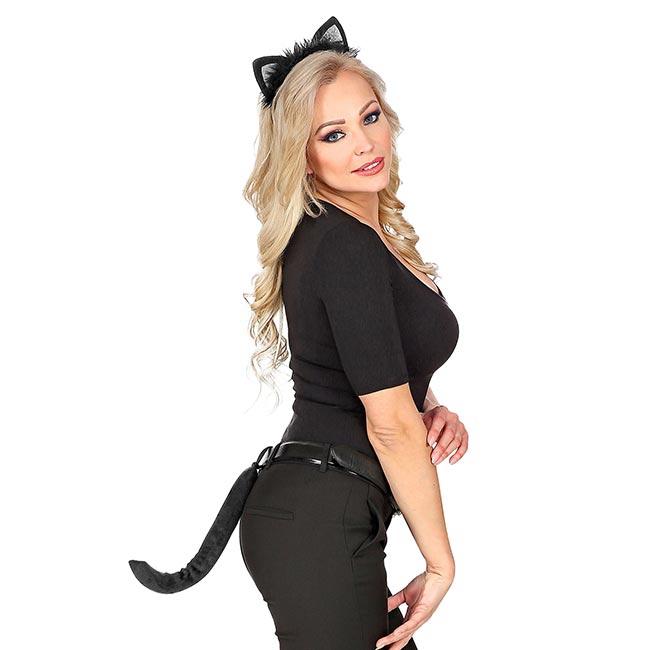Das Accessoire-Set Glamour-Katze umfasst zwei Teile: einen Haarreif und ein schwarzes Schwänzchen. Letzteres ist mit einem elastischen Band ausgestattet, sodass es an der Kleidung befestigt werden kann. An dem schwarzen Haarreif sind schwarze Ohren befestigt, die mittig sogar silberfarben glitzern. Er wird in einer Einheitsgröße für Erwachsene geliefert. Bitte beachten Sie, dass alle anderen Artikel, die Sie den Abbildungen entnehmen können, NICHT geliefert werden.
