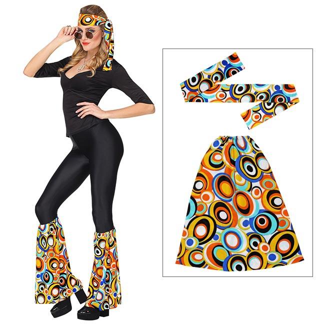 Mit diesem Accessoire-Set verwandeln Sie eine öde Leggings schnell in ein groovy Outfit zum Abtanzen! Das Set wird dreiteilig geliefert und besteht aus 2 Beinstulpen mit elastischem Bund, sowie einem farblich passenden Stirnband. Alle Bestandteile dieses Sets bestehen aus 95% Polyester sowie 5% Elasthan. Die Beinstulpen haben eine Länge von ca. 44 cm und werden einfach über Ihr Bein gestreift. Der elastische Bund hält alles an seinem Platz. Das Stirnband misst ca. 107 cm. Es kann zwischen den Farben Gelb-Weiß, Pink-Gelb, Orange sowie Blau-Grün gewählt werden. Klicken Sie bitte auf die gewünschte Option um ein genaues Produktbild Ihrer Farbauswahl zu sehen. Ob symmetrische oder unsymmetrische Kreise, Wellen oder Rauten, diese Muster passen hervorragend in die wilden 70er. Im Lieferumfang sind ausschließlich zwei Beinstulpen, sowie ein Stirnband in der von Ihnen ausgewählten Farbe enthalten. Andere abgebildete Artikel werden NICHT mitgeliefert. In unserem Shop erwarten Sie noch weitere tolle Accessoires.