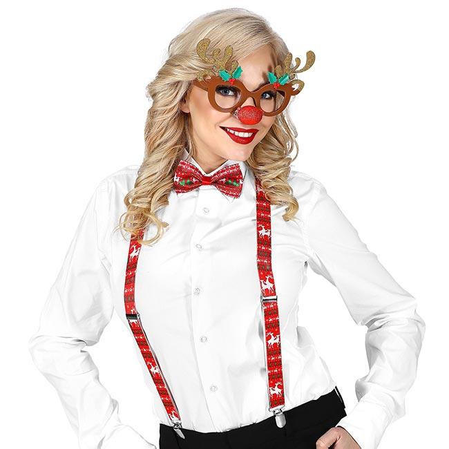 Das Accessoire-Set Rentier umfasst drei Teile: Hosenträger, Spaß-Brille und eine Fliege. Diese Fliege muss sogar nicht einmal selbst umgebunden werden, sondern kann ganz individuell und einfach auf die richtige Größe eingestellt werden. Bitte beachten Sie, dass lediglich diese drei Produkte im Lieferumfang enthalten sind. Alle anderen Artikel, die Sie den Abbildungen entnehmen können, werden NICHT geliefert. Die Hosenträger sind mit einem weihnachtlichen Design bedruckt und werden in einer Einheitsgröße für Erwachsene geliefert. Das Design (Grüne Tannenbäume, weiße Rentiere und Schneeflocken auf rotem Grund) findet sich auch auf der Fliege. Die Breite der Fliege beträgt ca. 12 cm. Die braune Spaß-Brille ist ca. 6 cm hoch (ohne Deko). An ihr ist noch eine glitzernde, rote Rentier-Nase befestigt. Auch ein goldenes, glitzerndes Geweih und Stechpalmenblätter mit Beeren runden das Gesamtbild dekorativ ab.