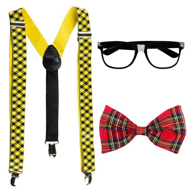 Das Accessoire-Set "Streber" besteht aus drei Teilen: Einer Brille, einer Fliege und Hosenträgern. Bitte beachten Sie, dass nur diese drei Artikel im Lieferumfang enthalten sind. Alle anderen werden NICHT geliefert. Die Fliege mit dem Schottenmuster ist überwiegend rot und misst ca. 19,5 cm. Sie wird mit Hilfe eines elastischen Bandes getragen. Das Brillengestell ist ca. 14,5 cm breit. Es handelt sich hierbei lediglich um eine Spaßbrille, es sind daher keine Gläser im Gestell eingesetzt. Die gelb-schwarz karierten Hosenträger runden das Outfit zusätzlich ab.