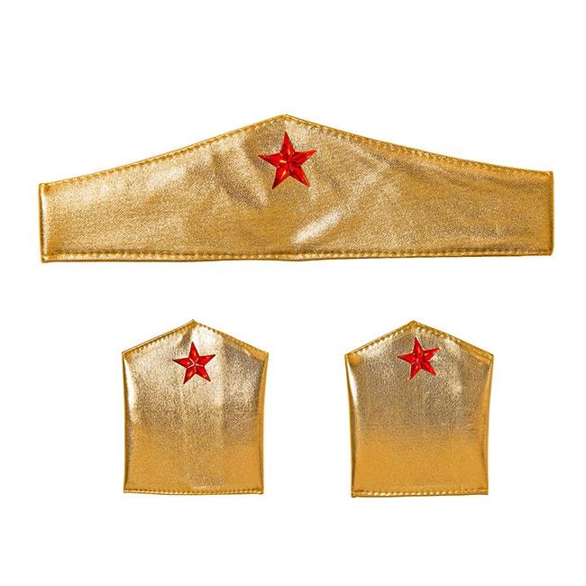 Das Accessoire-Set Superheldin umfasst drei Teile: ein Stirnband und zwei Armstulpen. Alle Artikel sind goldfarben, mit einem roten Stern versehen und äußerst dehnbar. Sie werden in einer Einheitsgröße für Erwachsene geliefert. Bitte beachten Sie, dass nur die genannten Artikel im Lieferumfang enthalten sind. Alle anderen Artikel, die Sie der Abbildung entnehmen können, werden NICHT geliefert. Die Armstulpen haben eine Länge von ca. 12,5 cm; die Höhe des Stirnbandes beträgt auf der Vorderseite ca. 7,8 cm.
