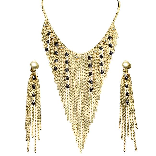 Dieses glamouröse Schmuckset eignet sich für ein ägyptisches Kostüm wie beispielsweise ein Kleopatra Kostüm. Es besteht aus zwei Ohrringen mit Klipsen und einer Halskette. An der Kette und an den Ohrringen hängen viele, goldene Kettenglieder und Schmucksteine als Verzierung.