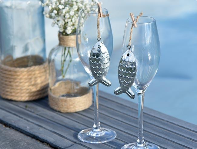 Der silbernen Anhänger "Fisch" wird direkt im 2er Pack geliefert. Beide Fische bestehen aus Metall und sind ca. 4 x 8 cm groß. Zur Befestigung dient ein Band aus Jute. Die beiden Anhänger sind nicht nur eine tolle Tischdeko, auch als Serviettenring oder als Anhänger in Gestecken sind sie ein echter Eyecatcher.