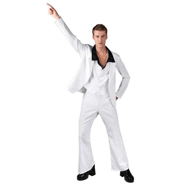 Werden Sie zum König der Tanzfläche! Der weiße Anzug "Disco König" ist 3-tlg. und besteht aus einer Weste mit schwarzem Kragen, einem Jackett sowie einer Hose. Alle drei Teile bestehen aus 100% Polyester. Die Weste sowie die Jacke werden mit Knöpfen geschlossen, die Hose hat einen Reißverschluss und einen Haken zum Schließen. Es kann zwischen den Größen 50/52 oder 54/56 gewählt werden. Im Lieferumfang sind ausschließlich Jacke, Weste und Hose enthalten. Andere abgebildete Artikel werden NICHT mitgeliefert.