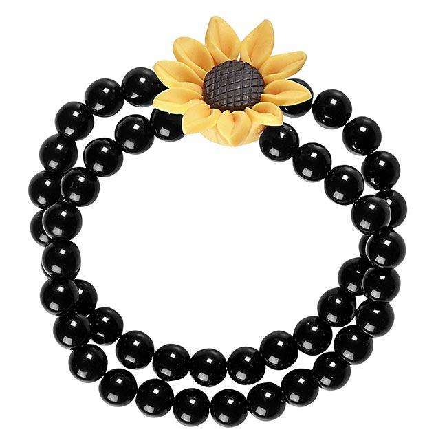 Das Armband "Sonnenblume" besteht aus Kunststoff und wird in einer Einheitsgröße für Erwachsene geliefert. Es ist doppelreihig, mit schwarzen Perlen ausgestattet und mit einer Sonnenblume versehen.