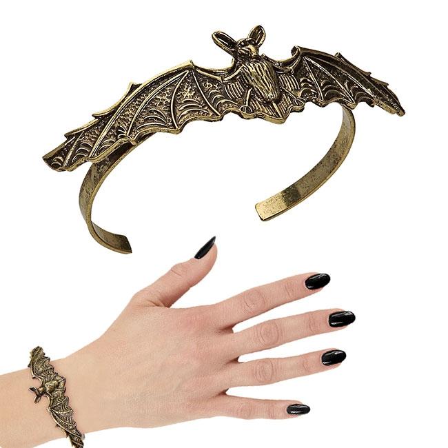 Der Armreif "Fledermaus" besteht aus Metall und ist messingfarben. Er wird in einer Einheitsgröße für Erwachsene geliefert und ist an der Unterseite offen. Der Armreif ist oval gestaltet und an der breitesten Stelle ca. 6,1 cm breit. Die dargestellte Fledermaus hat eine stolze Breite von ca. 9 cm. Im Lieferumfang ist ausschließlich der Armreif enthalten. Andere abgebildete Artikel werden NICHT mitgeliefert.