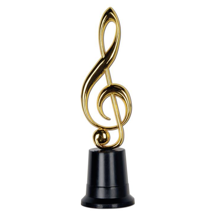Mehr Info: Die Statue besteht aus gold lackiertem Kunststoff auf einem schwarzen Sockel. Der Notenschlüssel ist ca. 15,5 cm hoch, die Gesamthöhe beträgt etwa 21 cm.
