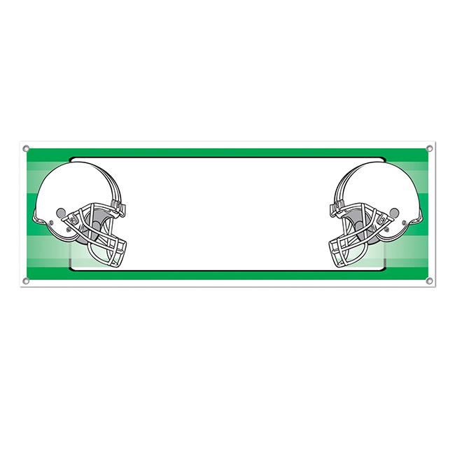 Das Banner "American Football" hat eine Größe von ca. 152 x 53 cm und besteht aus einseitig bedrucktem Kunststoff. Darauf sind zwei Helme und eine leere weiße Fläche zu sehen. Das Produkt kann problemlos an den Ösen an der Wand befestigt werden.