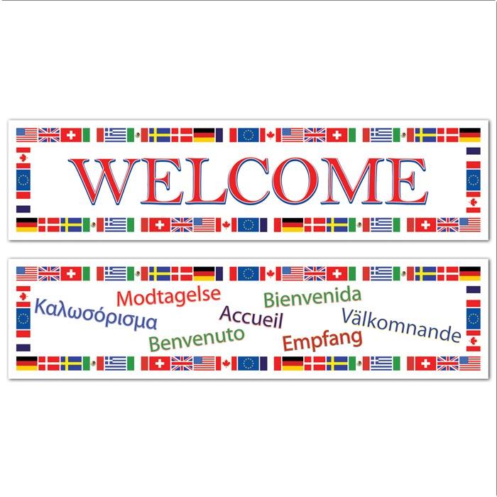 Diese beiden internationalen Banner sind eine tolle Deko, wenn man die Rückkehr von alten Freunden oder Gäste aus aller Herren Länder empfängt. Mit den Flaggen aus Italien, Griechenland, Mexiko, Schweden, Dänemark, Deutschland, Frankreich, Europa, Kanada, USA, Vereinigten Königreiche und der Schweiz. Auf einem Banner steht in großen Buchstaben "Welcome" ("Willkommen"). Auf dem zweiten Banner steht in den Sprachen spanisch, italienisch, schwedisch, französisch, deutsch, dänisch und griechisch das Wort Empfang/Willkommen.