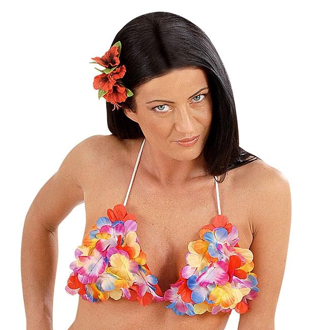 Dieses Accessoire ist ein schöner bunter BH, der perfekt zu Hawaii, Karibik und Strandfeeling passt. Er ist knapp gehalten und mit bunten Blumen bestückt. Somit macht es den Eindruck, als trügen Sie nur Blumen. Der BH wird ähnlich einem Bikini-Oberteil nur mit einer weißen Kordel festgebunden.