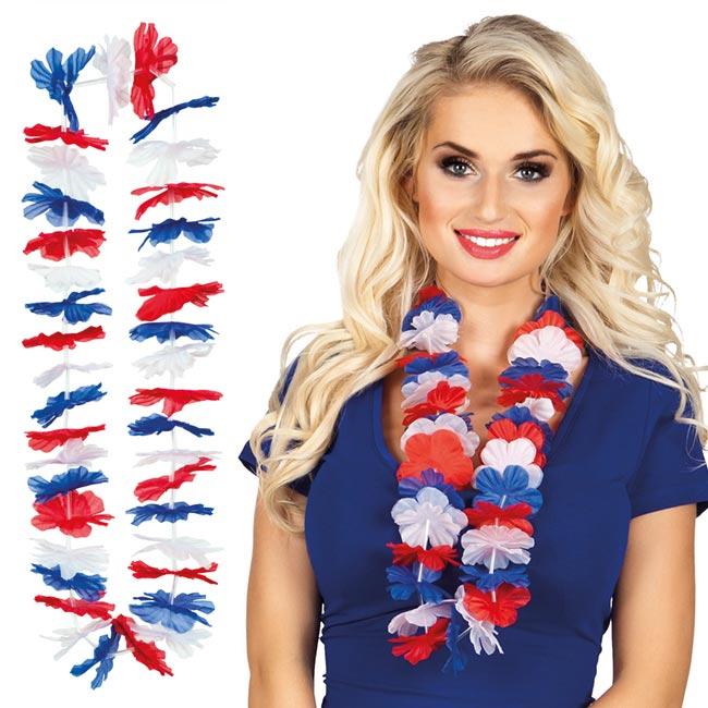 Die Blumenkette "Frankreich" besteht aus Kunststoff und Seidenblumen, die zusammen die Farben Frankreichs ergeben. Die Länge der Kette beträgt ca. 50 cm (Umfang ca. 100 cm).