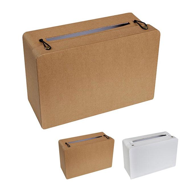 Diese tolle Briefbox in Form eines Koffers besteht aus Pappe und ist ca. 24 x 15,8 x 10 cm groß. An der Klappe befinden sich zwei Knöpfe, durch die die Box mit Gummibändern verschlossen werden kann. Es kann zwischen den Farben Natur und Weiß gewählt werden.