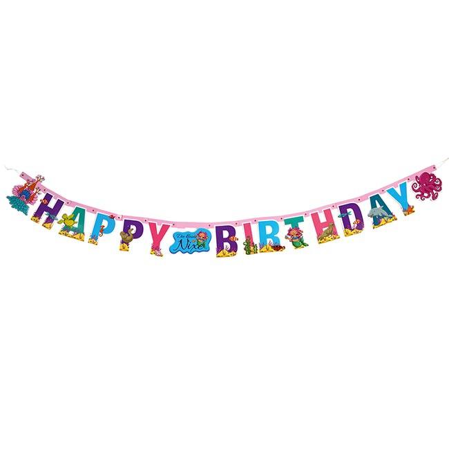 Die Buchstaben-Girlande "Die kleine Nixe" hat eine Länge von ca. 1,6 m. Sie besteht aus einseitig bedruckter Pappe und kann mit Hilfe der beigefügten Schnur an der Wand befestigt werden. An jedem der Buchstaben ist ein Meeresbewohner abgebildet. Zusammen bilden Sie den Schriftzug "Happy Birthday". Die einzelnen Elemente haben eine Höhe von ca. 13 cm.