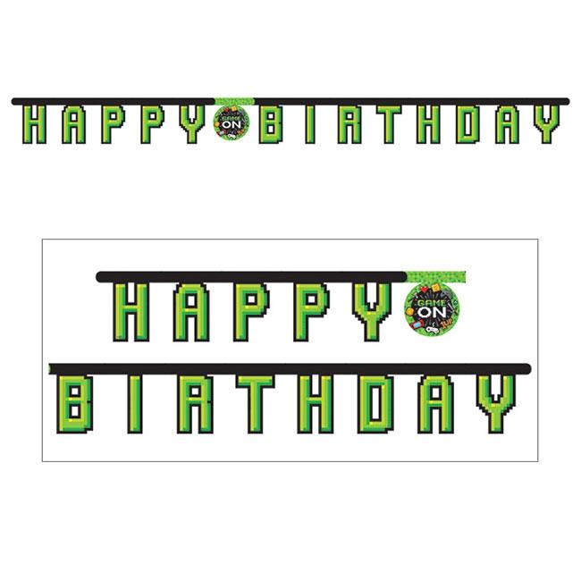 Die Buchstaben-Girlande "Gaming Party" hat eine Länge von ca. 2,20 m und besteht aus einseitig bedruckter Pappe. Die einzelnen Buchstaben haben eine Höhe von ca. 17,7 cm und bilden den Schriftzug "Happy Birthday". In der Mitte ist ein rundes Schild mit dem Schriftzug "Game On" und verschiedenen Symbolen aus bekannten Konsolen-Spielen. Mit Hilfe der beigefügten Schnur kann die Girlande ganz einfach an der Wand befestigt werden.