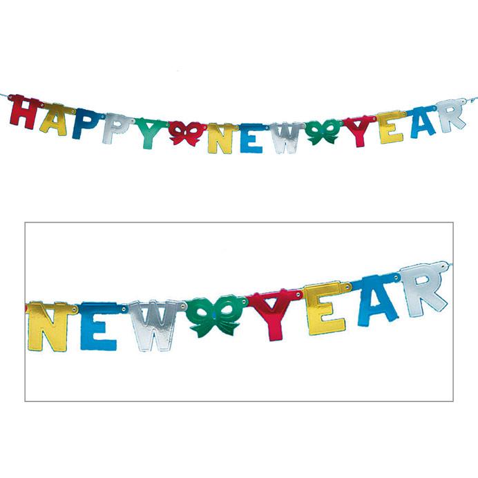 Mehr Info: Die Buchstaben-Girlande "Happy New Year" hat eine Gesamtlänge von etwa 156 cm und ist aus geschichtetem Karton gefertigt.