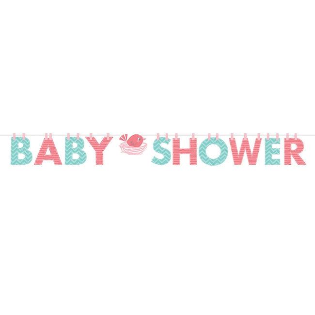 Die Buchstaben-Girlande "Hello Baby Girl" ist ca. 2,42 m lang und besteht aus Pappe. Auf der Rückseite sind die ca. 15,5 cm hohen Buchstaben Türkis. Zusammen formen die Buchstaben den Satz "Baby Shower", wobei die zwei Worte durch ein rosa Vögelchen im Nest getrennt sind. Die Buchstaben sind an einer Schnur aufgereiht, und schauen so aus als wären sie mit Wäscheklammern an einer Leine befestigt.