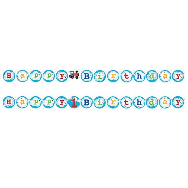 Die Buchstaben-Girlande "Kunterbunte Eisenbahn" ist ca. 3 m lang. Sie besteht aus dünner Pappe und wird inklusive einem roten Satinband geliefert. Die bunten Motive, mit einem Durchmesser von ca. 15,3 cm, formen zusammen den Satz "Happy Birthday". Zwischen den beiden Worten ist als Motiv ein Zug eingereiht. Dieses Motiv kann jedoch auch gegen eine 1 getauscht werden. Die Elemente sind einseitig bedruckt, die Rückseite ist hellblau.