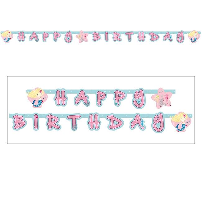 Die Buchstaben-Girlande "Niedliche Meerjungfrau" besteht aus Pappe und misst ca. 1,8 m. Jedes Element ist einseitig bedruckt und ca. 11,5 cm hoch. Verbunden sind die Elemente durch Metallösen. Anfang, Mitte und Ende der Girlande sind mit farbenfrohen Motiven und der kleinen Meerjungfrau abgegrenzt. Die Buchstaben formen zusammen den Satz „Happy Birthday“.