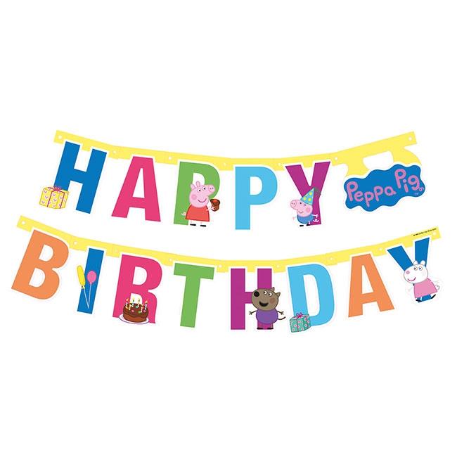 Die Buchstaben-Girlande "Peppa Wutz" ist ca. 143 cm lang und besteht aus einseitig bedruckter Pappe. Die Buchstaben sind maximal ca. 13,5 cm groß und sind über eine dünne Schnur, die durch die Ösen gezogen wurde, miteinander verbunden. Mit Hilfe dieser Schnur kann die Girlande auch ganz einfach an der Wand befestigt werden. Die Buchstaben sind bunt und bilden zusammen die Worte "Happy Birthday". Vor einigen dieser Buchstaben stehen sogar die tierischen Freunde von Peppa. Geschenke und Luftballons verzieren die Buchstaben zusätzlich.