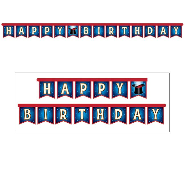 Die Buchstaben-Girlande "Showtime" ist ca. 2,2 m lang und ca. 17,7 cm hoch. Die einzelnen Elemente sind einseitig bedruckt und wie kleine Wimpel gestaltet. Zusammen formen sie den Satz "Happy Birthday". In der Mitte ist ein Element mit einem Zylinder eingebaut.