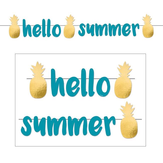 Die Buchstaben-Girlande "Sommerliche Ananas" ist ca. 1,25 m lang. Sie besteht aus einseitig bedruckter Pappe. Anfang, Mitte und Ende der Girlande, zieren goldene Ananas (ca. 8,4 x 18 cm). Die türkisenen Buchstaben (ca. 9 cm) formen den Satz „Hello Summer“.