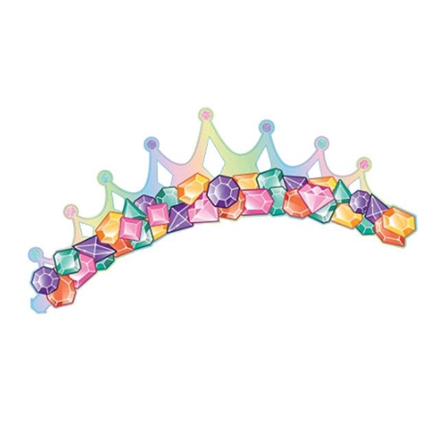 Die bunte Krone "Glänzender Auftritt" besteht aus einseitig bedruckter Pappe und ist in der Größe variabel. Von außen ist die Krone holografisch silbern, und zusätzlich mit bunten Edelsteinen bedruckt. Die Zacken haben zudem jeweils einen bunten Punkt der glitzert. Hingucker sind vier ca. 5 cm große, in Edelsteinform geschnittene Pappstücke die zusätzlich mit einem Klebepad hervorgehoben sind. Aufgeklappt hat die Krone eine Länge von ca. 65 cm, und kann durch insgesamt 10 Schlitze im Umfang von ca. 53 bis 60 cm verstellt werden. Die Höhe der Krone reicht von ca. 11 bis 18,5 cm.
