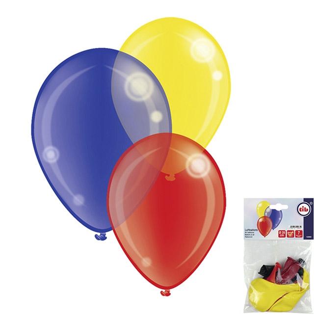 Die bunten Luftballons werden im 7er Pack geliefert. In der Packung befinden sie Ballons in den Farben rot, gelb und blau. Im aufgeblasenem Zustand erreichen die Ballons etwa einen Durchmesser von ca. 28 cm.