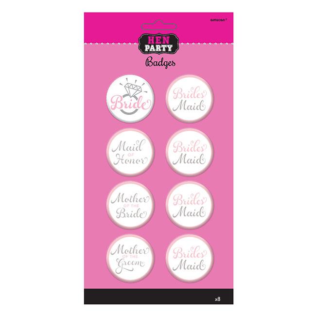 Das Button-Set "Bride to be" besteht aus 8 Buttons mit einem Durchmesser von ca. 4,3 cm. Insgesamt gibt es 4 Brautjungfern-Buttons (Brides Maid) und jeweils einmal Braut (Bride), Trauzeugin (Maid of Honor) Mutter der Braut (Mother of the Bride) und Mutter des Bräutigams (Mother of the groom). Die Buttons sind in den Farben pink, weiß und silber.