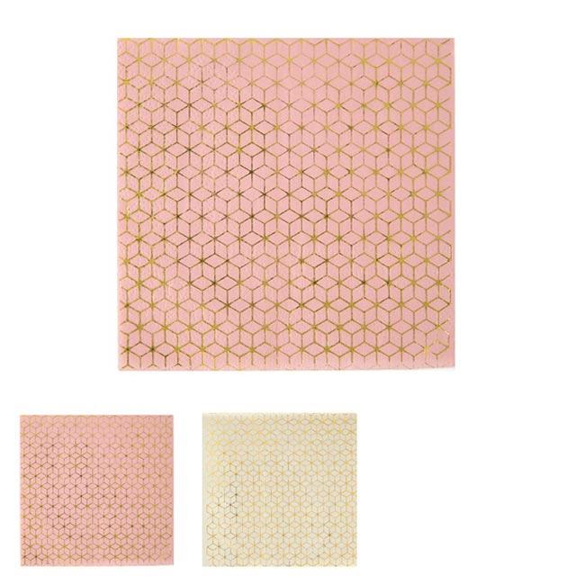 Die Cocktail-Servietten "Edler Geo-Print" werden im 20er Pack geliefert und bestehen aus Papier. Sie haben im gefalteten Zustand eine Größe von ca. 12,3 x 12,5 cm. Aufgefaltet kommen sie auf eine Größe von ca. 24,6 x 25 cm. Es kann zwischen den Farben Rosa und Beige gewählt werden. Die rosafarbenen Servietten sind mit einem modernen Rautenmuster in Kupfer bedruckt. Die beigefarbenen Servietten haben das gleiche Muster in der Farbe Gold. Die Servietten haben einen geprägten Rand.