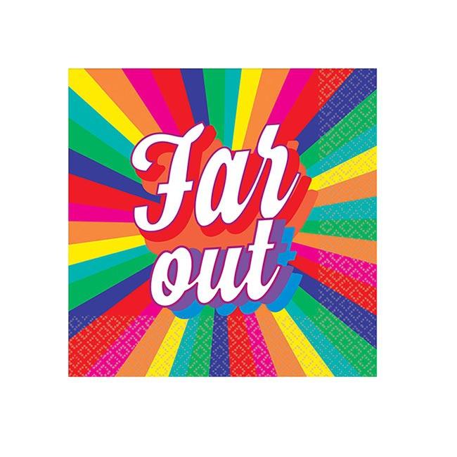 Die Cocktail-Servietten "Groovy Vibes" bestehen aus zweilagigem Papier und werden im 16er Pack geliefert. Gefaltet haben die bunten Servietten eine Größe von ca. 12,5 x 12,5 cm, entfaltet sind sie ca. 25 x 25 cm groß. Neben kunterbunten Strahlen die vom Zentrum der Serviette wegstrahlen, ist die Mitte noch mit den Worten „Far out“, was so viel wie „cool“ bedeutet, bedruckt.