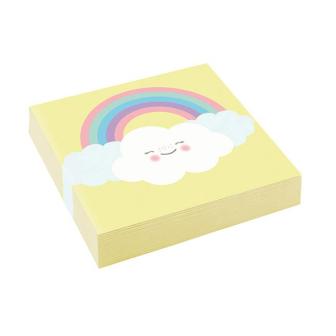 Die Cocktail-Servietten "Wölkchens Geburtstag" haben einen geprägten Rand, sind dreilagig und werden im 20er Pack geliefert. Sie sind einseitig in Gelb gehalten und mit einer kleinen lächelnden Wolke bedruckt aus der ein Regenbogen entspringt. Gefaltet haben die niedlichen Servietten eine Größe von ca. 12,5 x 12,5 cm, heißt sie kommen entfaltet auf ca. 25 x 25 cm.