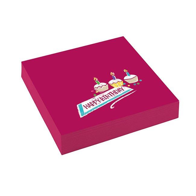 Die Cocktailservietten "My Birthday Party" werden im 20er Pack geliefert und sind gefaltet ca. 12,5 x 12,5 cm groß. Entfaltet messen die dreilagigen Servietten ca. 25 x 25 cm. Das Design in Bordeauxrot wird lediglich durch Cupcakes mit Kerzen, sowie einem Banner mit „Happy Birthday“ aufgepeppt. Das Motiv ähnelt einer Bleistiftzeichnung.