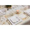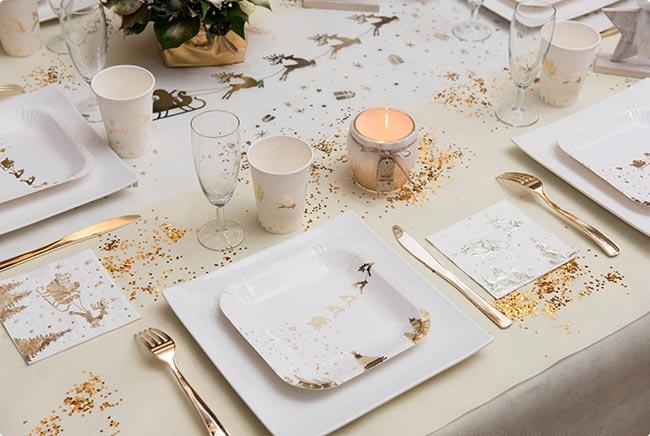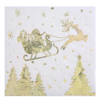 Die kleinen Servietten "Wintermärchen" werden im 20er Pack geliefert und bestehen aus Papier. Aufgefaltet haben die Cocktailservietten eine Größe von ca. 25 x 25 cm. Auf den überwiegend weißen Servietten sind metallisch schimmernde Silhouetten in der Farbe Gold abgebildet. Tannenbäume, Sterne, der Weihnachtsmann in seinem Schlitten und das Rentier schimmern bei Lichteinfall besonders schön und sorgen für einen richtigen Weihnachtszauber auf der gedeckten Tafel.