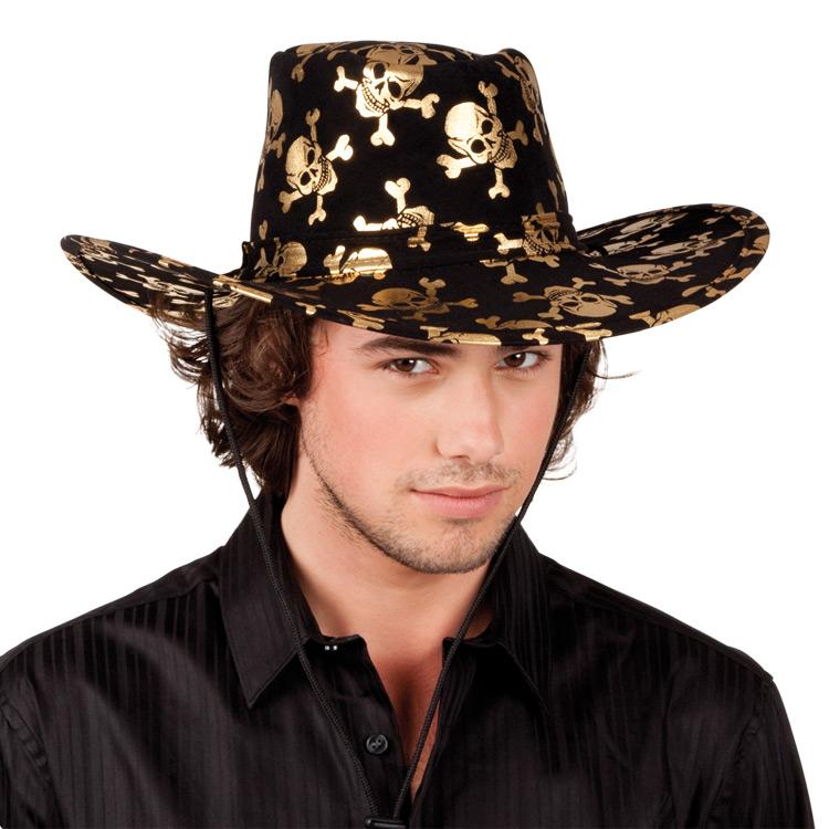 Dieser schöne Cowboyhut ist in der Grundfarbe schwarz. Er ist mit vielen goldenen Piraten-Totenköpfen bedruckt. Unten am Hut befinden sich zwei Kordeln, die zur Befestigung am Kopf bzw. Kinn dienen.