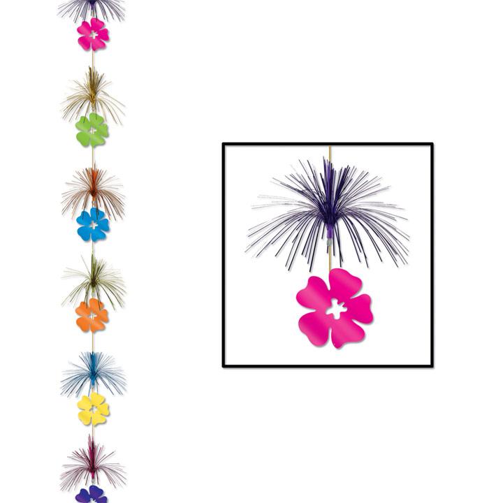 Zu einer perfekten Hawaiiparty gehört natürlich auch die perfekte Deko für Ihre Location. Die Deckendeko "Bunter Blütenzauber mit Fontänen" passt einfach super ins Bild, denn bunte Hibiskusblüten in lila, blau, orange, gelb, grün und pink machen das Aloha-Feeling komplett. Über jeder Blüte ist eine bunte Fontäne angebracht und durch die Verarbeitung aus metallischer Folie ist die Deko auch bestens für diverse Außenbereiche, wie Strand oder Garten, geeignet.