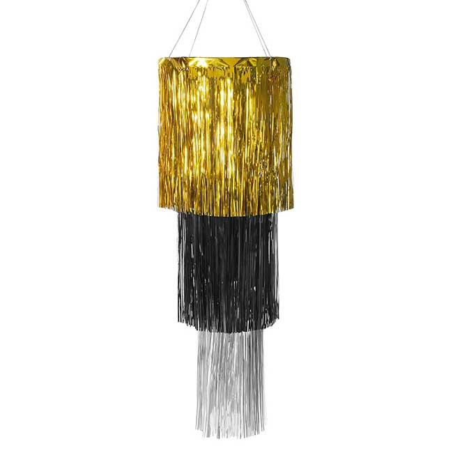 Der Kronleuchter aus goldenem, silbernem und schwarzem Lametta fällt definitiv auf. Mit einer großzügigen Länge von etwa 110 cm und einem Durchmesser von circa 40 cm bringt dieser Kronleuchter eine tolle Dekoration auf Ihre Party. Vielseitig einsetzbar passt er zu zahlreichen Anlässen, wobei er sich besonders für Themenpartys wie die glamourösen 20er Jahre oder Ihre unvergessliche Silvesterparty eignet. Feiern Sie wie die Stars und setzen Sie ein Statement auf Ihrer Party!
