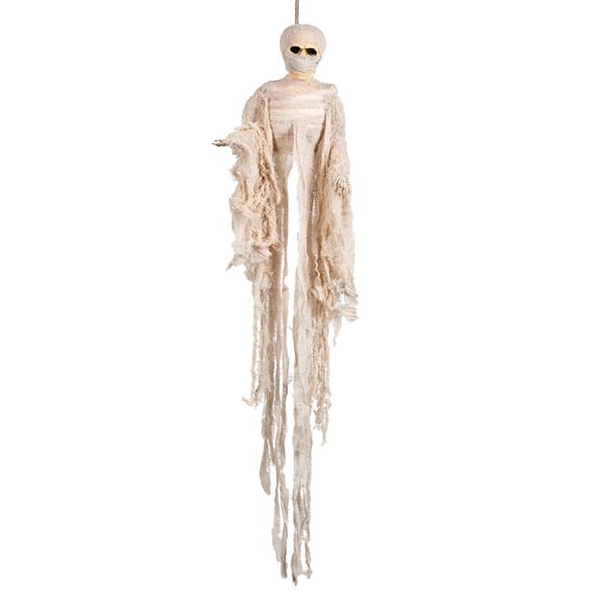 Die Deckendeko mumifiziertes Skelett besteht aus Kunststoff und kann ganz einfach mit Hilfe der schwarzen Schlaufe aufgehängt werden. Sie ist ca. 100 cm lang. Das Skelett ist stellenweise mit (teils zerrissenen) Bandagen umwickelt, die vom übrig gebliebenen Oberkörper herunterhängen.