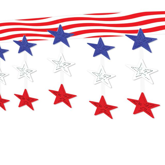 Die Deckendeko "Stars & Stripes" ist aus Kunststoff gefertigt und sieht einfach toll aus. Sie besteht aus einer ca. 370 cm langen Kunststofffolien, an deren beiden Enden breite Rollen befestigt sind, damit die Deckendeko Ihre Form behält. An dieser Folie sind unzählige Kunststoff-Hänger befestigt die jeweils mit 3 Sternen in den Farben Blau, Weiß und Rot. So schaffen Sie einen Blickfang in Ihrer Party-Location!