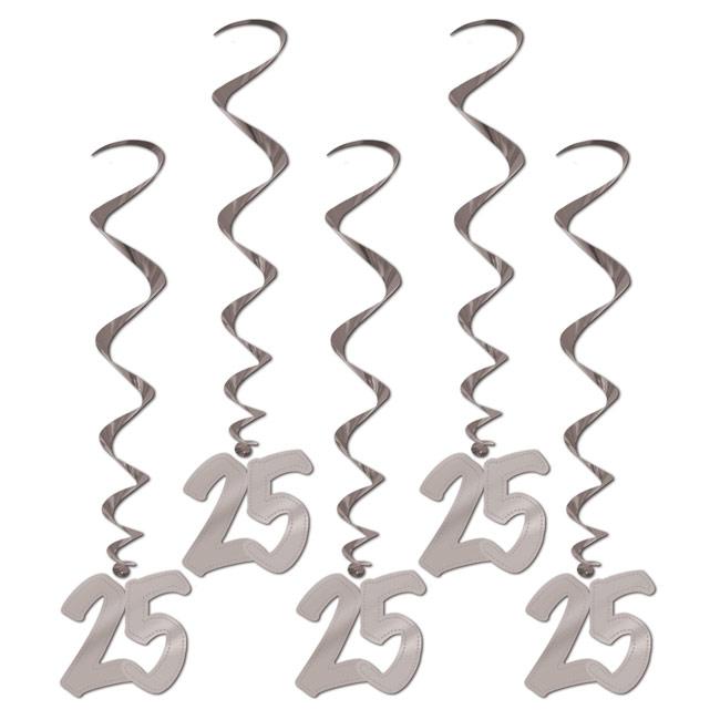 Was sagt die Zahl 25 aus? Es könnte sich um ein Jubiläum handeln, um einen Geburtstag oder um die silberne Hochzeit. Ganz egal wofür, diese Deckenhänger sehen klasse aus. Sie bestehen aus Folie und durch die silberne Farbe wirken sie sehr edel. Das Band ist spiralförmig und am Ende ist die Zahl 25 angebracht. Die Länge der Deckendekoration beträgt ca. 91 cm und wird im 5er Pack geliefert. Der Durchmesser der Zahl beträgt ca. 15 cm.