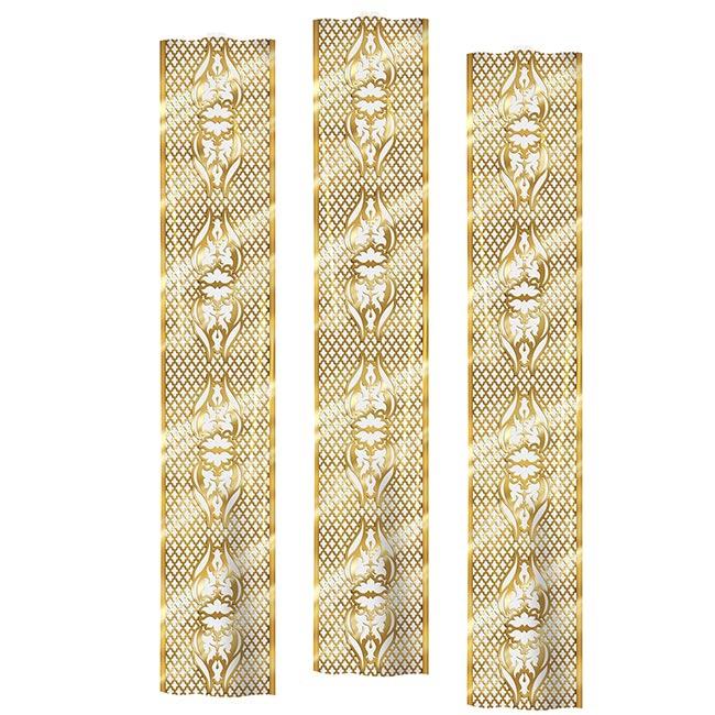 Die Deckenhänger aus Folie "Arabische Nächte" werden im 3er Pack geliefert. Sie haben eine Länge von ca. 183 cm und eine Breite von ca. 30 cm. Im Lieferumfang sind drei transparente Nylon-Schnüre enthalten, mit denen Sie die Deckenhänger problemlos an der Decke befestigen können. Die Deckenhänger bestehen aus transparenter Folie und sind einseitig mit goldenen Ornamenten im orientalischen Stil bedruckt.