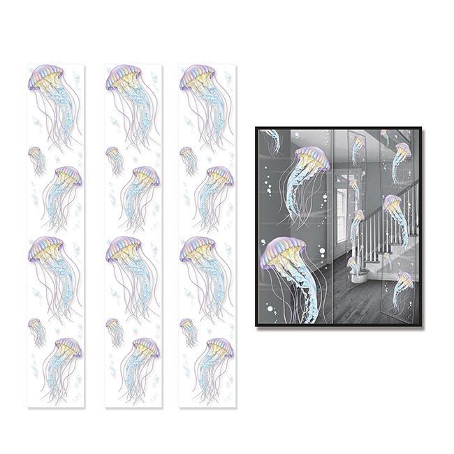Die Deckenhänger "Quallen" sind ca. 30 cm breit und ca. 183 cm lang. Geliefert werden drei transparente Deckenhänger aus Folie, die einseitig mit Quallen in Pastellfarben bedruckt sind. Mit Hilfe der Nylon-Schnüre können die Folien ganz einfach an der Decke oder aber auch an einer Wand fixiert werden.