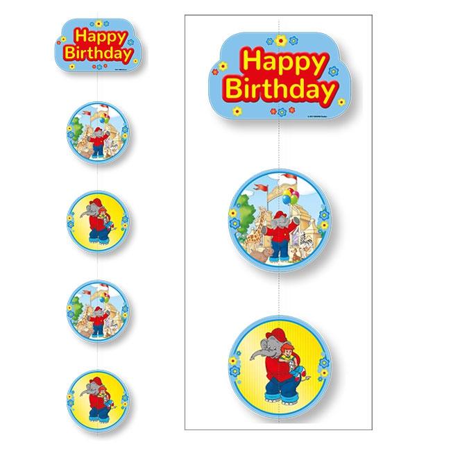 Der Deckenhänger "Benjamin Blümchen" hat eine Länge von ca. 1,5 m und wird mit einem Nylonfaden zur Befestigung an der Decke geliefert. Er besteht aus fünf bunten Papp-Ausschnitten, die beidseitig bedruckt sind. Die vier kreisrunden Motive haben einen Durchmesser von ca. 18 cm und zeigen Benjamin Blümchen mit seinem Freund Otto. Der erste Papp-Ausschnitt ist hingegen mit "Happy Birthday" beschriftet und hat eine Größe von ca. 25 x 15 cm.