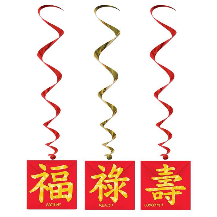 Was könnte typischer im asiatischen Bereich sein, als die verschiedenen, chinesischen Schriften und Zeichen?! Mit den tollen Deckenhängern Chinesische Zeichen treffen Sie genau ins Schwarze! Die 3 Wirbel-Deckenhänger haben unterhalb jeweils ein viereckiges Pappschild befestigt. Auf jedem roten Schild findet sich ein gelbes Zeichen wieder, wie Wealth (Gesundheit), Fortune (Glück) und Longevity (ein langes Leben).