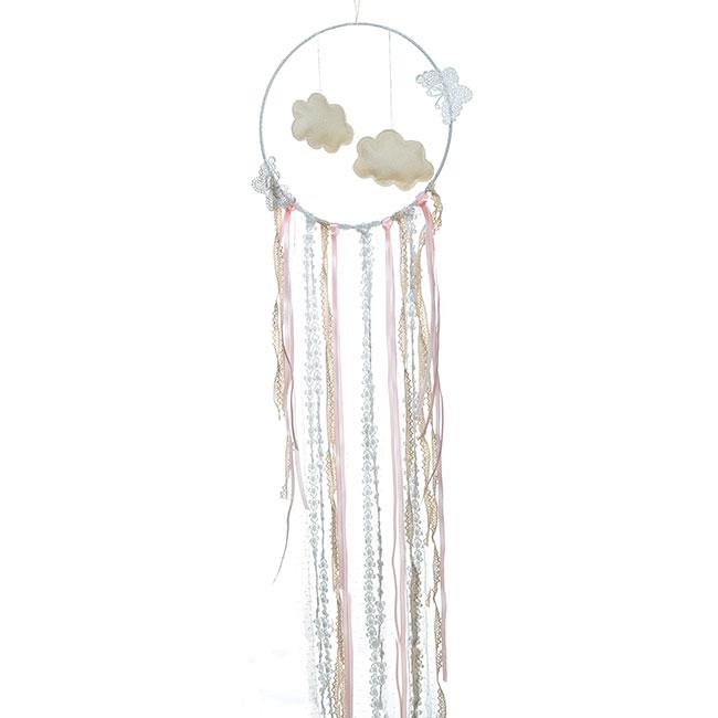 Der Deckenhänger "Frühlingszauber" besteht aus Polyester und wird mit einer Schlaufe zur Befestigung an der Decke oder an der Wand geliefert. Ohne diese Schlaufe gemessen hat die Deko eine Länge von ca. 95 cm. Der Durchmesser des mit Stoff bezogenen Kreises beträgt ca. 25 cm. An ihm sind Schmetterlinge aus Spitze und zwei Wolken befestigt. Die Auswahl an verschiedenen Stoffen am unteren Rand bringt Abwechslung in die hängenden Bänder: Grobe weiße oder naturfarbene Spitze, Satinbänder in der Farbe Rosa und Netzstoff wechseln sich gegenseitig ab und ergeben ein besonders stimmiges Bild.