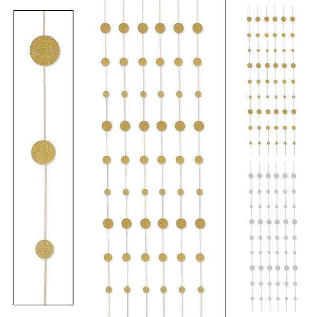 Die Deckenhänger "Glitzernde Kreise" bestehen aus Pappe und Papier. Geliefert werden sechs Deckenhänger, die eine Länge von ca. 183 cm aufweisen. Je nach Auswahl sind die mit Glitzer überzogenen Kreise gold- oder silberfarben. Der Durchmesser der Kreise, die außerdem durch eine Schnur miteinander verbunden sind, variiert von ca. 3 - 5 cm.