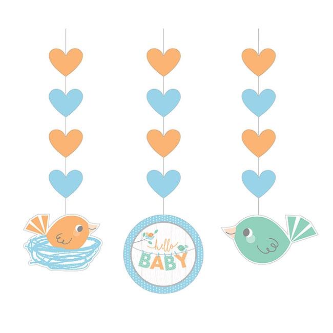 Die Deckenhänger "Hello Baby Boy" bestehen aus Pappe und werden dreiteilig geliefert. Sie sind ca. 91,4 cm lang, und bestehen aus jeweils vier Herzen (ca. 7,5 x 6 cm) sowie einem größeren Anhänger (zwischen 13 und 17,5 cm) am unteren Ende. Herzen als auch Anhänger sind beidseitig bedruckt. Neben zwei niedlichen Vögeln, davon ein kleiner im Nest, steht auf dem größeren Anhänger "Hello Baby".